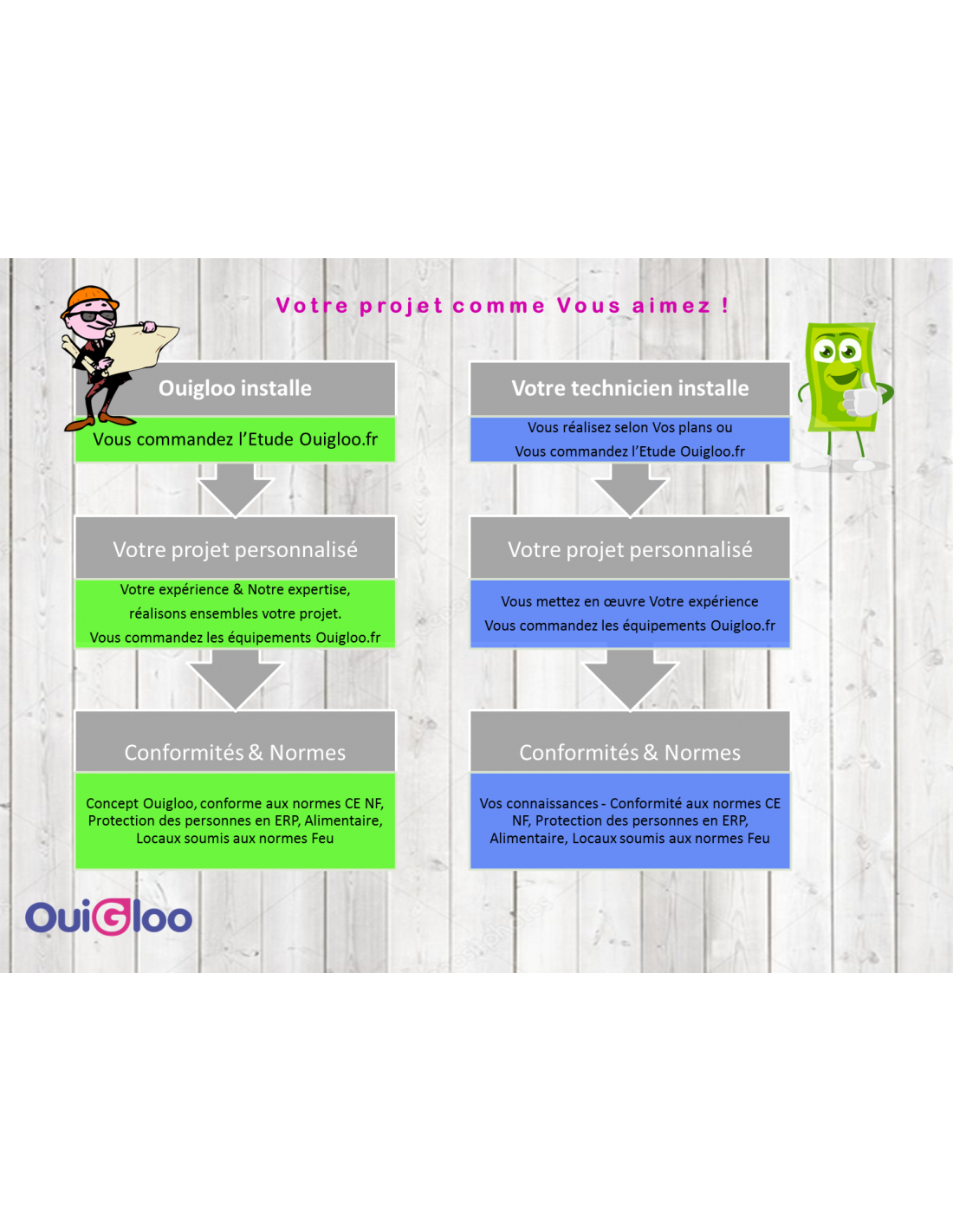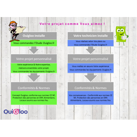 Atelier de transformation à la ferme et Point de vente Circuit-court en Pays de la Loire. Ce concept Ouigloo.fr transporte votre rêve en réalité dans le respect du Code du Travail et des règles sanitaires concernant votre production de viande bovine, caprine ou porcine. L'étude et le plan ouigloo.fr vous permettent, de réaliser votre atelier de transformation et point de vente dans le respect des règlementations et de répondre à Votre obligation de mettre en œuvre le Plan de Maîtrise Sanitaire PMS avec le Guide des Bonnes Pratiques d'Hygiène sur la méthode du Hasard Analysis Critical Control Point HACCP. Cette obligation s'applique en particulier dans le cas de la dispense sanitaire, voir INFO dans le configurateur. Le projet est complété d'un centre d'emballage des œufs CEO, réelle plus-value à votre production fermière. Le point de vente circuit-court associé dépasse la source de revenu pour devenir la vitrine de vos spécialités et faire rayonner la qualité de vos produits. D'autres producteurs ont alors envie de compléter votre offre. Un investissement raisonné et rentable: Les solutions Ouigloo.fr sont éligibles au FEADER et autres subventions Energie et Environnement C2E.